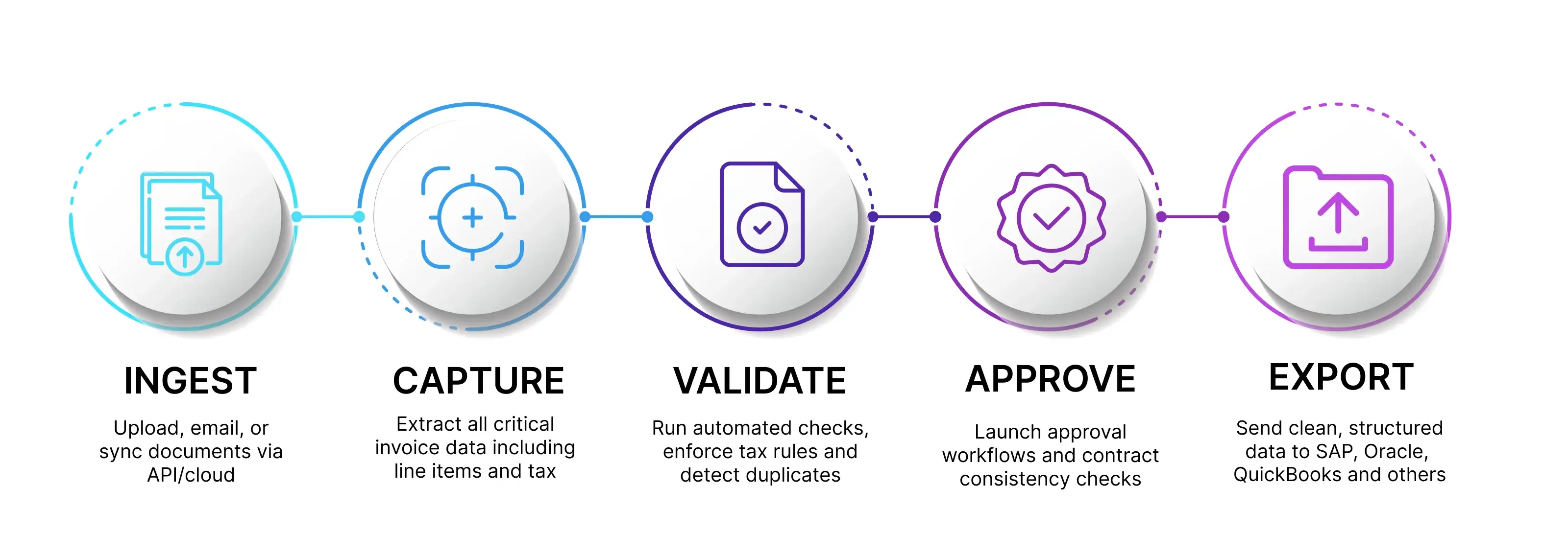 | Business Rule Configuration | Flexible, no-code rules to validate data fields, totals, tax logic, and approvals. |